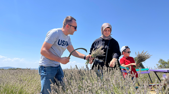 Morun her tonunu barındıran bahçede hasat yağan misafirler lavantadan yapılan gazoz, bal, sirke, parfüm gibi ürünleri inceledi. Lavanta toplayan turist ve misafirler fotoğraflanırken, ortaya kartpostallık görüntüler çıktı.
