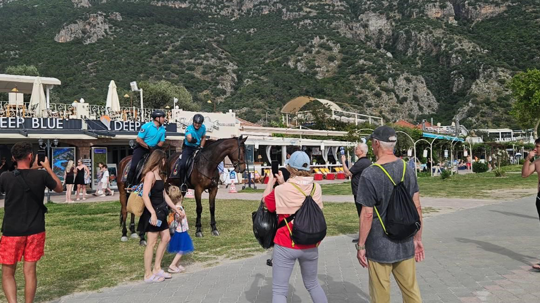 Muğla’nın Fethiye ilçesinde atlı jandarma timlerini görenler, hayrete düştü. Plajda güneşlenen turistler at üzerindeki jandarmalarının fotoğraflarını çekti.