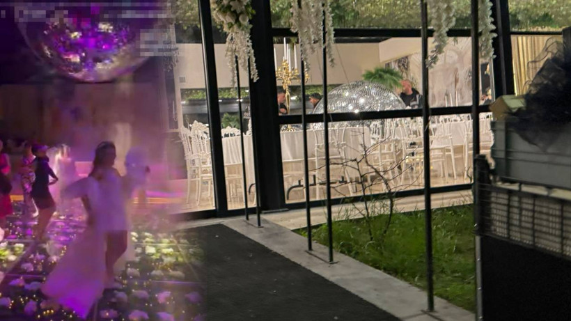 O anlar, salonda bulunan bir kişinin cep telefonu kamerasına da yansıdı. Görüntülerde, gelin ve damadın konuklarla birlikte eğlendiği sırada, dev disko topunun hemen üstlerinde sallandığı görülüyor.