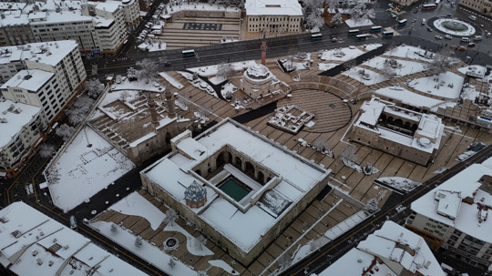 Tarihi Kent Meydanı’nda karla kaplanan cami, medrese ve diğer yapılar adeta masalsı bir görünüme büründü. Meydan, dronla havadan görüntülenerek eşsiz manzaralar kayıt altına alındı.