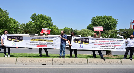 İETT'ye bağlı özel halk otobüsü sahipleri ödemelerini alamadıkları gerekçesiyle Saraçhane'deki İstanbul Büyükşehir Belediyesi (İBB) binası önünde bir araya geldi.