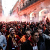 Galatasaray kafilesi müzik eşliğinde otobüs camlarına vurarak stada giriş yaptı.