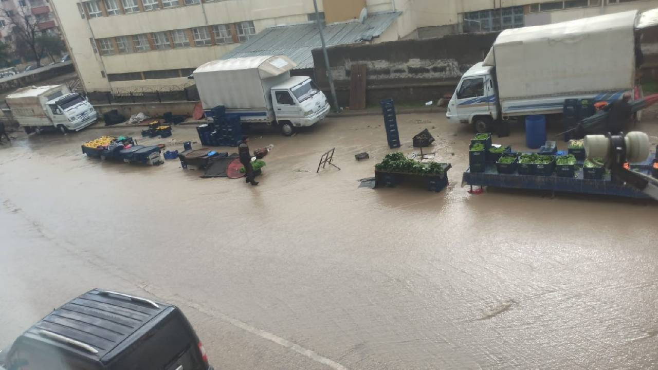Yağışla birlikte pazar tezgahlarında kurulu bulunan şemsiyeler devrildi, sebze ve meyve dolu kasalar sel sularına kapılarak sürüklendi. Pazarcı esnafı zarar gören tezgahlarını kurtarmaya çalışırken, o anlar vatandaşların cep telefonu kameralarına yansıdı.